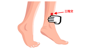 • 三陰交(さんいんこう):足首内側のくるぶしから指4本分上